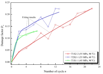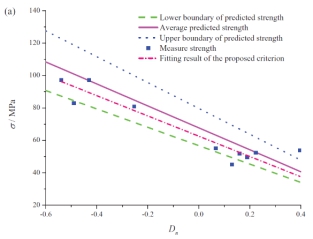 针对玄武岩初步探索了岩石在循环温度和循环应力作用下的力学性质和损伤模型。开展循环应力-温度试验以及循环后的单轴压缩试验,揭示了玄武岩在循环应力-温度作用下的受力损伤特性;根据已有的循环温度下岩石试验结果,构建了只有循环温度作用的岩石损伤模型;根据循环-温度作用下岩石变形特征,通过连续介质损伤力学以及统计损伤力学概念推演得到岩石损伤模型(图13),该模型可精准描述岩石在循环应力和循环温度作用下的损伤演化。另外,将基于Weibull 分布的岩石损伤本构模型进行拓展,提出同时考虑循环应力和循环温度同时作用的岩石损伤本构模型;基于最小耗能原理,考虑循环应力-温度引起的损伤,建立了岩石在循环应力-温度耦合作用下的强度准则(图44)。