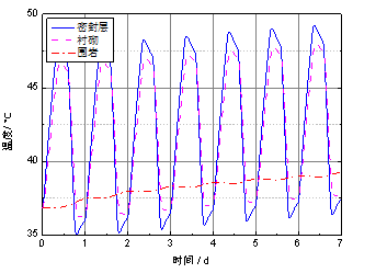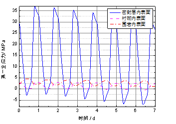 图1 第一周内压气储能洞室温度变化 | 图2 第一周内压气储能洞室第一主应力 |