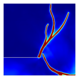 针对岩石断裂模型,申请人团队近年来致力于改进传统相场法的局限性,并将相场法引入岩石力学领域。构建了不同物理场作用、不同材料属性情况下岩石断裂的高性能相场模型,提出了相应的关键算法和实现方法,较好地解决了相场模型在岩石力学领域应用时的诸多限制。同时,建立了相场断裂模型的快速建模方法,从而能够对岩石断裂过程中的裂纹面时空演化进行具体量化,阐明了岩石内部裂纹起裂、扩展、偏转、分叉以及合并等现象的断裂机制。